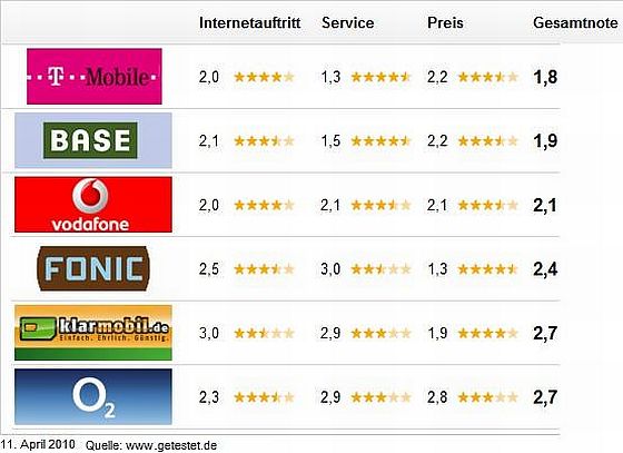 Unterm Strich macht T-Mobile die beste Figur – vor allem beim Internetauftritt und Service. Vodafone bietet das derzeit schnellste Netz und liefert die flexibelsten Tarife für Gelegenheitssurfer. Preissieger für Tagesflats ist FONIC. klarmobil siegt bei der besten Internet Flat ohne Limit. BASE und O2 liegen im Mittelfeld, wobei BASE sich mit gutem Service und einfachem Tarifmodell hervortut. O2 kann dafür mit dem besseren Netz Punkte sammeln.